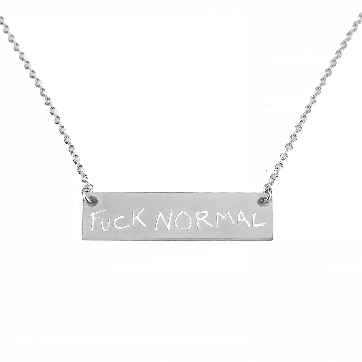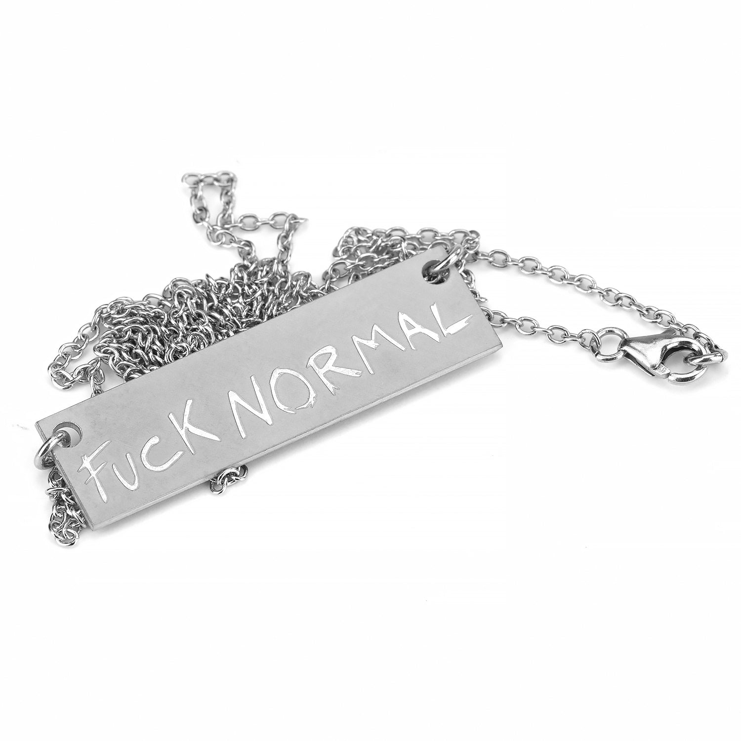 A bold message, carved in metal. This 925 sterling silver piece, entirely crafted in Italy, is a symbol of rebellion and authenticity. Its design, clean yet provocative, echoes the shape of a minimalist box logo, with the phrase “FUCK NORMAL” engraved in raised lettering on the surface.