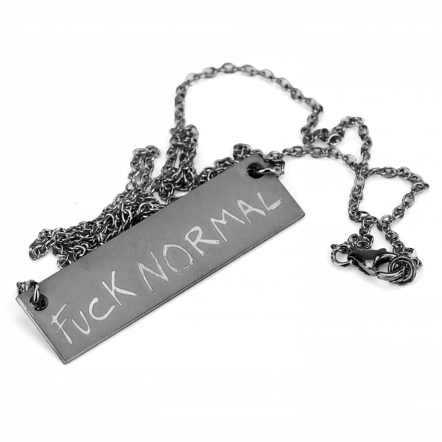 A bold message, carved in metal. This 925 sterling silver piece, entirely crafted in Italy, is a symbol of rebellion and authenticity. Its design, clean yet provocative, echoes the shape of a minimalist box logo, with the phrase “FUCK NORMAL” engraved in raised lettering on the surface.