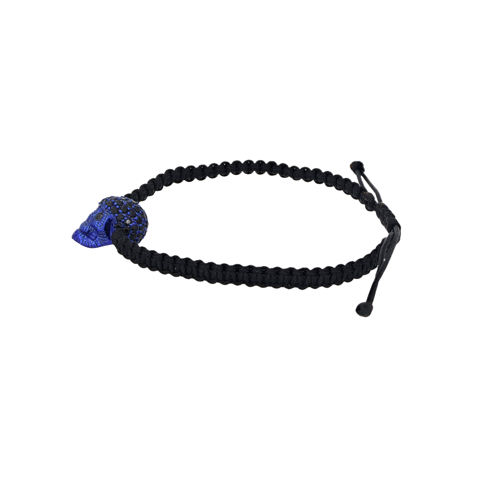 Black Braided Bracelet with Pavé Skull with Blue Nanoceramic Coating and Black Stones