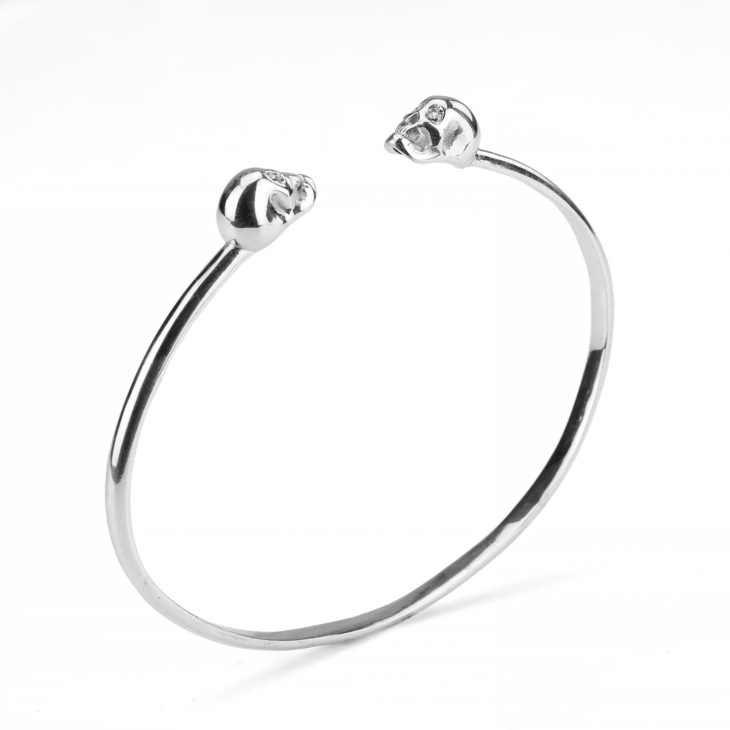 A bold expression of craftsmanship and style. This rigid bracelet in 925 sterling silver, entirely crafted in Italy, features two skulls with hand-set stones, creating a striking effect that captures light and attention.