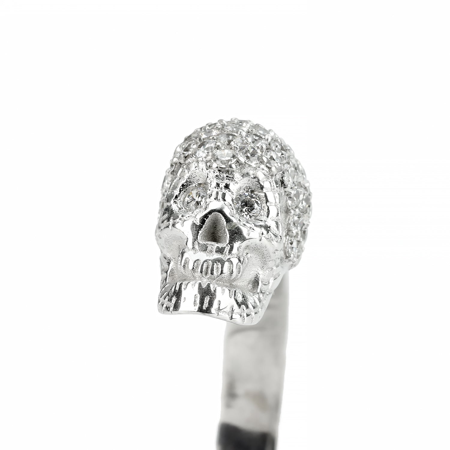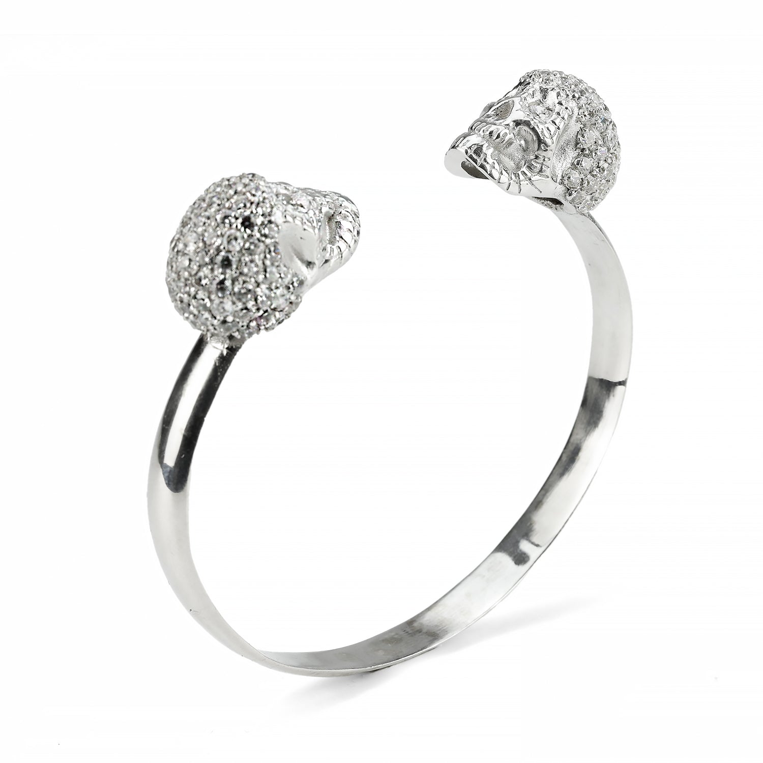 A bold statement of craftsmanship and style. This rigid bracelet in 925 sterling silver, entirely crafted in Italy, features two XL skulls adorned with hand-set stones, creating a dazzling pavé effect that captures every glance.